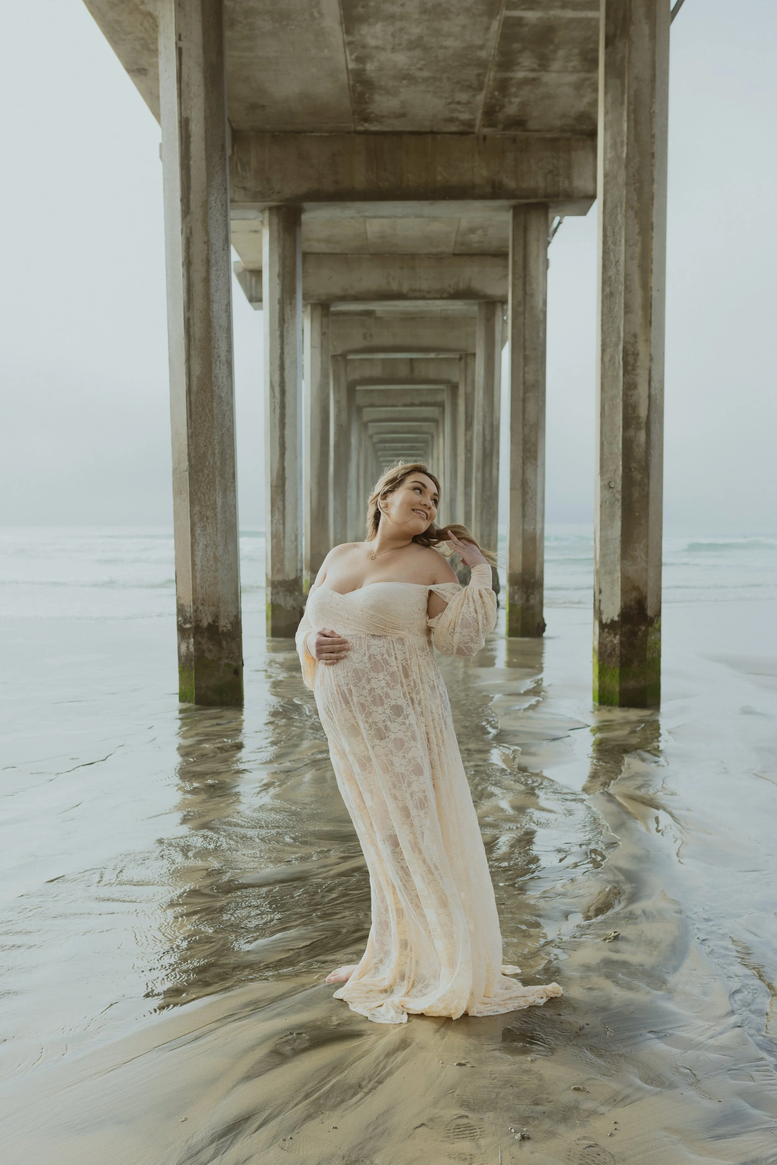 Nothing like a moody day at the beach in San Diego, and it just creates that soft romantic connection between her and her baby. She stands out so well and this pier is iconic for a variety of photoshoots. La Jolla can be a bit crowded towards golden hour, and sometimes can be cloudy. If you do shoot on a cloudy day, make sure to check the reports! This was shot 2 hours before sunset since golden hour wasn’t happening anyways, but I was able to achieve the soft cool toned editing.